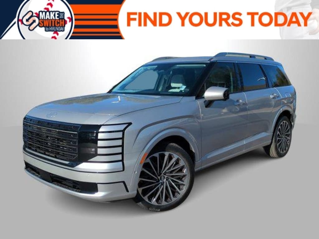 Typhoon Silver Metallic 2026 Hyundai Palisade Calligraphy AWD 8-Speed Automatic V6 100W Charging Cable, 14 Speakers, 3rd row seats: split-bench, 4-Wheel Disc Brakes, ABS brakes, Air Conditioning, Alloy wheels, AM/FM radio: SiriusXM, Apple CarPlay & Android Auto, Audio memory, Auto High-beam Headlights, Auto-dimming door mirrors, Auto-dimming Rear-View mirror, Auto-leveling suspension, Automatic temperature control, Brake assist, Bumpers: body-color, Cargo Net, Carpeted Floor Mats, Compass, Cross Rails, Delay-off headlights, Driver door bin, Driver vanity mirror, Dual front impact airbags, Dual front side impact airbags, Electronic Stability Control, Emergency communication system: None, Exterior Parking Camera Rear, First Aid Kit, Four wheel independent suspension, Front anti-roll bar, Front Bucket Seats, Front Center Armrest, Front dual zone A/C, Front reading lights, Fully automatic headlights, Garage door transmitter: HomeLink, Genuine wood console insert, Genuine wood dashboard insert, Heads-Up Display, Heated and Ventilated Front Bucket Seats, Heated door mirrors, Heated front seats, Heated rear seats, Heated steering wheel, HVAC memory, Illuminated entry, Knee airbag, Leather steering wheel, Low tire pressure warning, Memory seat, Navigation System, Occupant sensing airbag, Option Group 01, Outside temperature display, Overhead airbag, Overhead console, Panic alarm, Passenger door bin, Passenger vanity mirror, Power door mirrors, Power driver seat, Power Liftgate, Power moonroof, Power passenger seat, Power steering, Power windows, Premium Nappa Leather Seat Trim, Radio data system, Radio: Infotainment Navigation System, Rain sensing wipers, Rear air conditioning, Rear anti-roll bar, Rear audio controls, Rear reading lights, Rear side impact airbag, Rear window defroster, Rear window wiper, Reclining 3rd row seat, Remote keyless entry, Security system, Speed control, Split folding rear seat, Spoiler, Steering wheel mounted audio controls, Tachometer, Telescoping steering wheel, Tilt steering wheel, Traction control, Trip computer, Turn signal indicator mirrors, Variably intermittent wipers, Ventilated front seats, Ventilated rear seats, Wheels: 21 x 8.5J Alloy.