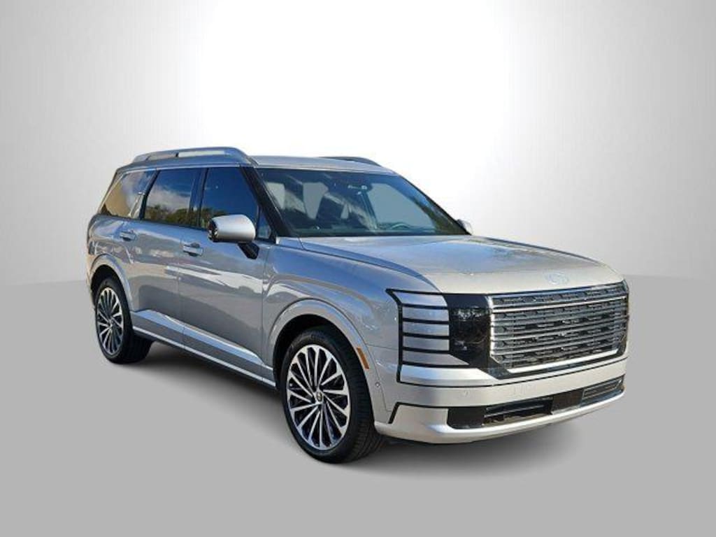 Typhoon Silver Metallic 2026 Hyundai Palisade Calligraphy AWD 8-Speed Automatic V6 14 Speakers, 3rd row seats: split-bench, 4-Wheel Disc Brakes, ABS brakes, Air Conditioning, Alloy wheels, AM/FM radio: SiriusXM, Apple CarPlay & Android Auto, Audio memory, Auto High-beam Headlights, Auto-dimming door mirrors, Auto-dimming Rear-View mirror, Auto-leveling suspension, Automatic temperature control, Brake assist, Bumpers: body-color, Carpeted Floor Mats, Compass, Delay-off headlights, Driver door bin, Driver vanity mirror, Dual front impact airbags, Dual front side impact airbags, Electronic Stability Control, Emergency communication system: None, Exterior Parking Camera Rear, Four wheel independent suspension, Front anti-roll bar, Front Bucket Seats, Front Center Armrest, Front dual zone A/C, Front reading lights, Fully automatic headlights, Garage door transmitter: HomeLink, Genuine wood console insert, Genuine wood dashboard insert, Heads-Up Display, Heated and Ventilated Front Bucket Seats, Heated door mirrors, Heated front seats, Heated rear seats, Heated steering wheel, HVAC memory, Illuminated entry, Knee airbag, Leather steering wheel, Low tire pressure warning, Memory seat, Navigation System, Occupant sensing airbag, Option Group 01, Outside temperature display, Overhead airbag, Overhead console, Panic alarm, Passenger door bin, Passenger vanity mirror, Power door mirrors, Power driver seat, Power Liftgate, Power moonroof, Power passenger seat, Power steering, Power windows, Premium Nappa Leather Seat Trim, Radio data system, Radio: Infotainment Navigation System, Rain sensing wipers, Rear air conditioning, Rear anti-roll bar, Rear audio controls, Rear reading lights, Rear side impact airbag, Rear window defroster, Rear window wiper, Reclining 3rd row seat, Remote keyless entry, Security system, Speed control, Split folding rear seat, Spoiler, Steering wheel mounted audio controls, Tachometer, Telescoping steering wheel, Tilt steering wheel, Traction control, Trip computer, Turn signal indicator mirrors, Variably intermittent wipers, Ventilated front seats, Ventilated rear seats, Wheels: 21 x 8.5J Alloy.
