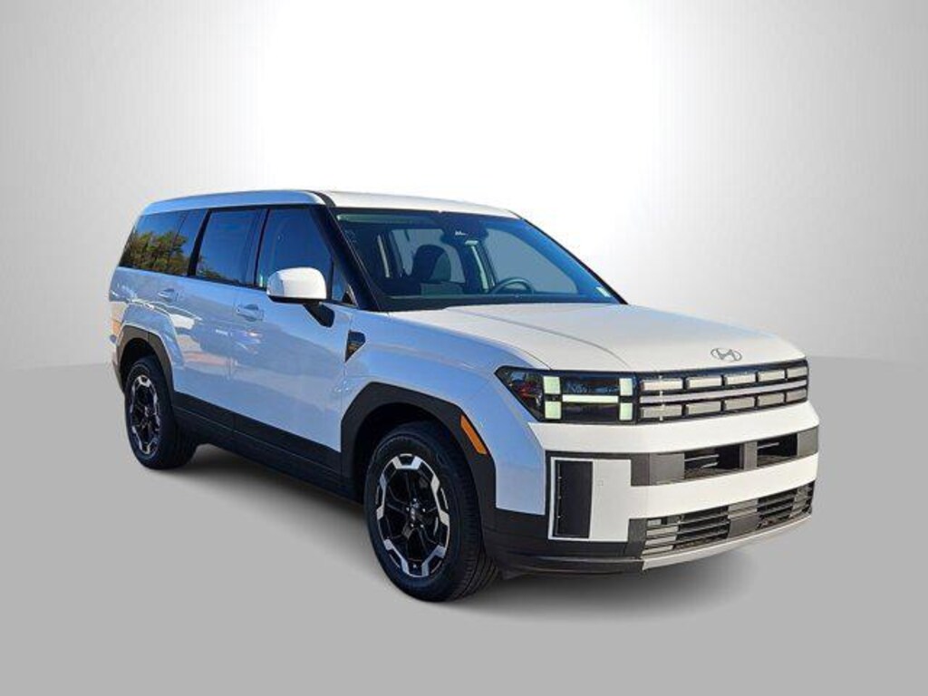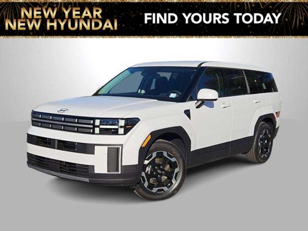 Serenity White 2026 Hyundai Santa Fe SE FWD 8-Speed Automatic with SHIFTRONIC 2.5L I4 Black Cloth, 18 x 7.5J Alloy Wheels, 3rd row seats: bench, 4-Wheel Disc Brakes, 6 Speakers, ABS brakes, Air Conditioning, All Season Fitted Liners, Alloy wheels, AM/FM radio: SiriusXM, Apple CarPlay & Android Auto, Auto High-beam Headlights, Brake assist, Bumpers: body-color, Cargo Net, Carpeted Floor Mats, Delay-off headlights, Driver door bin, Driver vanity mirror, Dual front impact airbags, Dual front side impact airbags, Electronic Stability Control, Emergency communication system, Exterior Parking Camera Rear, First Aid Kit, Four wheel independent suspension, Front anti-roll bar, Front Bucket Seats, Front Center Armrest, Front reading lights, Fully automatic headlights, Heated door mirrors, Illuminated entry, Knee airbag, Leather steering wheel, Low tire pressure warning, Occupant sensing airbag, Option Group 01, Outside temperature display, Overhead airbag, Overhead console, Panic alarm, Passenger door bin, Passenger vanity mirror, Power door mirrors, Power Liftgate, Power steering, Power windows, Radio: AM/FM/HD Display Audio, Rear anti-roll bar, Rear seat center armrest, Rear side impact airbag, Rear window defroster, Rear window wiper, Remote keyless entry, Roadside Assistance Kit, Security system, Speed control, Speed-sensing steering, Split folding rear seat, Spoiler, Steering wheel mounted audio controls, Tachometer, Telescoping steering wheel, Tilt steering wheel, Traction control, Trip computer, Variably intermittent wipers, YES Essentials Stain-Resistant Cloth Seat Trim, Black Cloth.