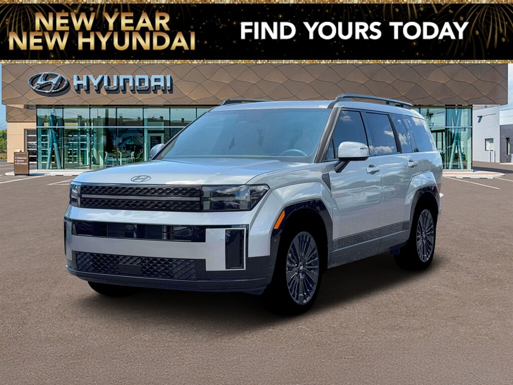 Shimmering Silver 2026 Hyundai Santa Fe Hybrid Calligraphy FWD 6-Speed Automatic with Shiftronic I4 I4, 12 Speakers, 3rd row seats: bench, 4-Wheel Disc Brakes, ABS brakes, Air Conditioning, Alloy wheels, AM/FM radio: SiriusXM, Apple CarPlay & Android Auto, Auto High-beam Headlights, Auto-dimming Rear-View mirror, Automatic temperature control, Brake assist, Bumpers: body-color, Cargo Cover/Screen, Cargo Net, Cargo Tray, Carpeted Floor Mats, Delay-off headlights, Driver door bin, Driver vanity mirror, Dual front impact airbags, Dual front side impact airbags, Electronic Stability Control, Emergency communication system, Exterior Parking Camera Rear, Four wheel independent suspension, Front anti-roll bar, Front Bucket Seats, Front Center Armrest, Front dual zone A/C, Front reading lights, Fully automatic headlights, Garage door transmitter: HomeLink, Heads-Up Display, Heated & Ventilated Front Bucket Seats, Heated door mirrors, Heated front seats, Heated rear seats, Heated steering wheel, Illuminated entry, Knee airbag, Leather steering wheel, Low tire pressure warning, Memory seat, Navigation System, Occupant sensing airbag, Option Group 01, Outside temperature display, Overhead airbag, Overhead console, Panic alarm, Passenger door bin, Passenger vanity mirror, Power door mirrors, Power driver seat, Power Liftgate, Power moonroof, Power passenger seat, Power steering, Power windows, Quilted Premium Nappa Leather Seat Trim, Radio: AM/FM/HD Bose Premium Audio System, Rain sensing wipers, Rear anti-roll bar, Rear side impact airbag, Rear window defroster, Rear window wiper, Remote keyless entry, Security system, Speed control, Speed-sensing steering, Split folding rear seat, Spoiler, Steering wheel mounted audio controls, Tachometer, Telescoping steering wheel, Tilt steering wheel, Traction control, Trip computer, Turn signal indicator mirrors, Variably intermittent wipers, Ventilated front seats, Wheels: 20 x 8.5J Unique Dark Finish Alloy, I4.
